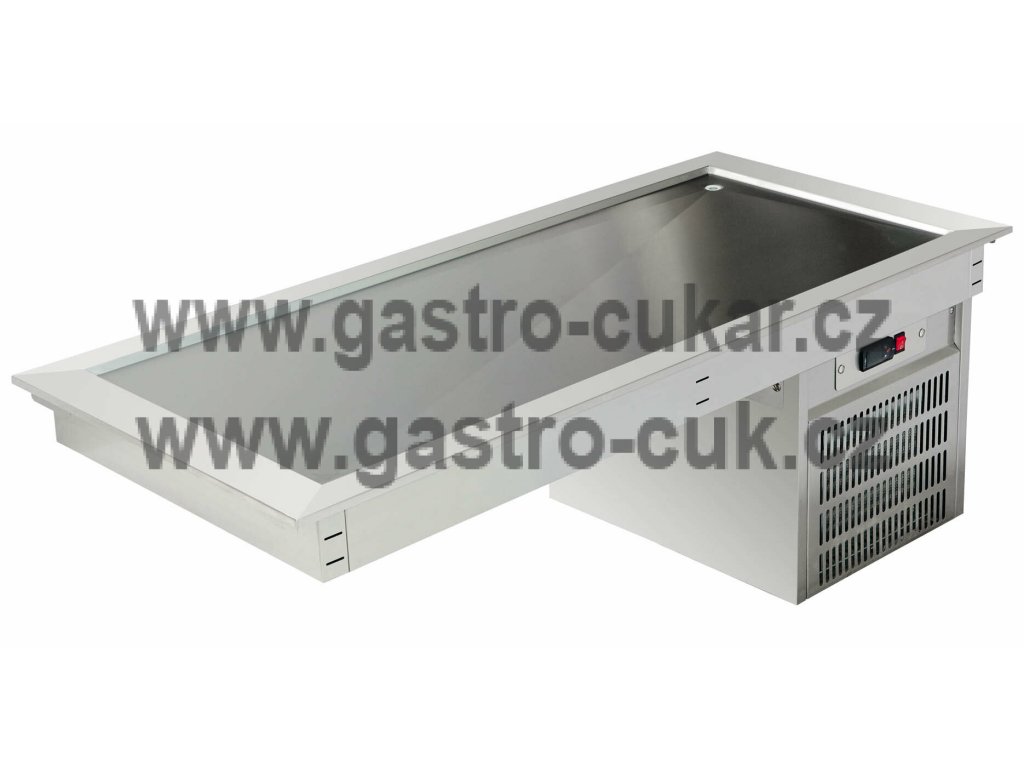Vestavná chladící prolamovaná deska ASBER, model DRTP-511HC (ekologické chladivo) v celonerezovém provedení s vestavěným chladícím agrgátem, ovládána elektronickým termostatem s displejem a regulací (0°až 8°C) s centrálním vypínačem. Nedělená vana s hloubkou 10 mm vhodná pro plechy GN1/1. Vana je opatřena výpustí 1/2". Agregát s automatickým odtáváním a odpařováním kondenzátu. Polohovatelné kotvící prvky společně s lemem vany zajišťují přilnavost k pracovní desce po celé ploše. Chlazená horní deska v rozměru vhodným pro 5 GN1/1 (hloubka vany10mm) s vestavěným chladícím agregátem. Speciálně vyrobené z vysoce kvalitní nerezové oceli pro náročné profesionální provozy. Pracovní plocha (vana) zapuštěná 10 mm pod horní deskou. Ovládací panel s intuitivním digitálním ovládáním, umožňujícím snadné nastavení teplotních parametrů a světelné tlačítko start-stop. Zásobník s automatickým odpařováním kondenzující vody z pracovní desky. Vestavba je připravena pro volitelnou instalaci lehkého potravinového hygienického zákrytu, snadno namontovatelný na postranní konstrukci. Statické chlazení pomocí lisované měděné cívky zabudované pod dno vany, izolované polyuretannem (izolace s vysokou hustotou (40 kg / m3) vstřikované pod vysokým tlakem). Speciální svorky po stranách zajišťují fixaci a rovnoměrné uložení a přilnavost vestavby k pracovní desce po celé ploše. Zaoblený okraj hrany a 1/2” vypouštěcí ventil umístěný ve spodní desce pro snazší čištění. Připojení na odpad je povinné. Provozní teplota desky : 0°C až +8°C (v podmínkách klimatické třídy IV) Chladivo: R600a (HC) Provozní napětí: 230V/1N/50Hz.