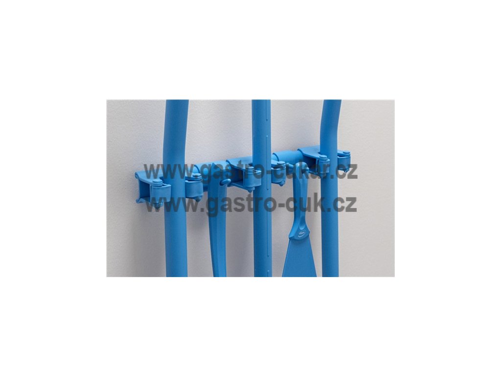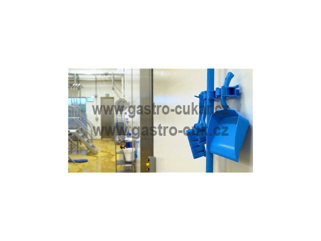 Modrá varianta modulárního nástěnného držáku pro uložení hygienického nářadí a pomůcek na pracovišti. Barevné varianty jsou určeny k použití v rámci barevného kódování. Lištu lze snadno připevnit na 4 nástěnné držáky nasunutím z pravé nebo levé strany. K dispozici jsou dva druhy úchytů – jeden pro zavěšení (háček) a jeden pro pevné uchycení. Na lištu lze umístit 1-10 úchytů (Max. 10 háčků na zavěšení nebo max. 5 na pevné uchycení). Úchyt pro pevné uchycení pojme produkty o průměru 28–33 mm. Háček udrží produkty o hmotnosti až 3 kg. Systém se dodává se 3 úchyty pro pevné uchycení a 2 háčky. Produkt lze snadno rozebrat za účelem čištění nebo výměny.