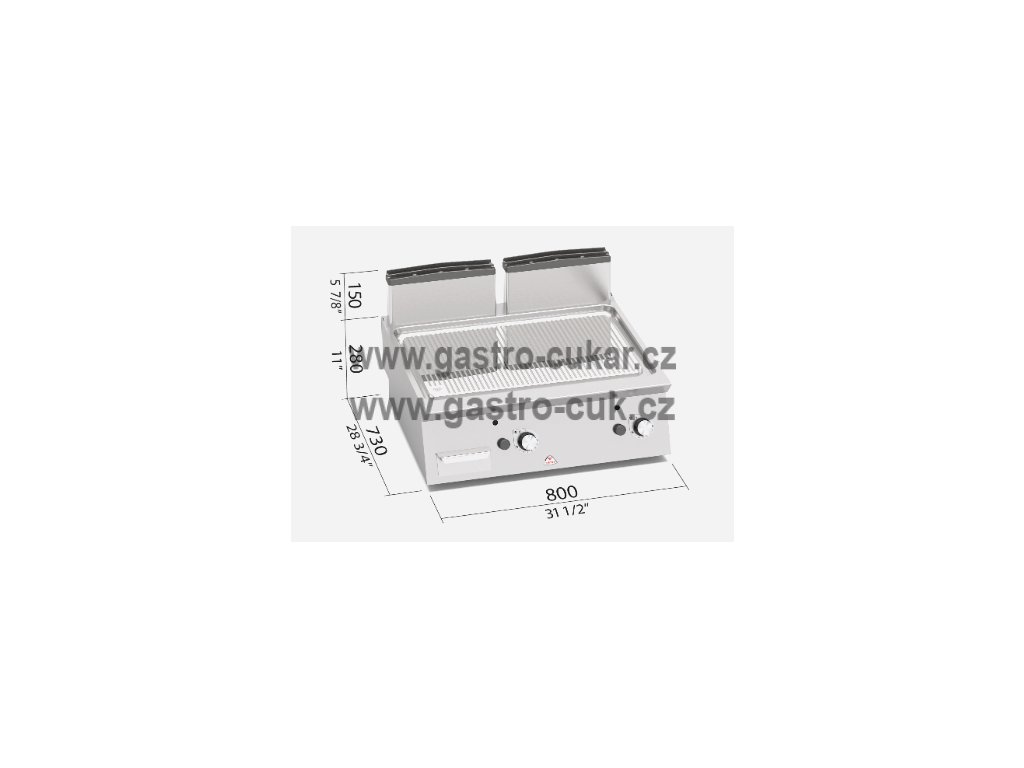 Termostatický ventil 30 až 300°C pro přesnou a bezpečnou regulaci. Termočlánek a chráněný zápalný plamínek. Dvě zóny s nezávislým ovládáním a přesnou regulací teploty. Dvojvrstvá grilovací plotna složená z ocelového plátu a horní vrstvy z nerez oceli AISI 316 s leštěným povrchem, který umožňuje snadné čištění (odkapová plocha okolo celé grilovací desky). Zvýšené postranní lemy. Kompaktní provedení s otevřeným podstavcem. Pracovní deska z kvalitní nerez oceli AISI 304 tloušťka 2 mm (20/1), přední a boční opláštění z nerezové oceli AISI 304. Dvojvrstvá grilovací plotna (umístěná v prolisované zesílené pracovní desce, tloušťka 2 mm, vybavena odtokovým otvorem) složená z ocelového plátu a horní vrstvy z nerez oceli AISI 316 s leštěným povrchem, který umožňuje snadné čištění. Nízká úroveň odlesku zvyšuje komfort při práci.