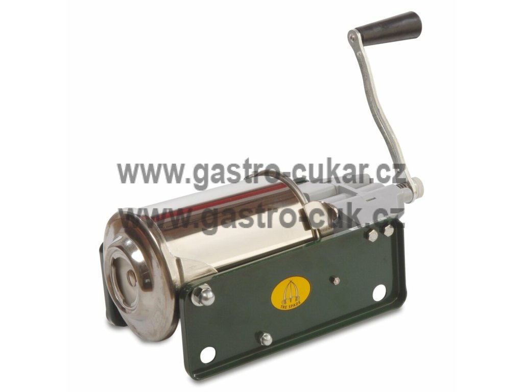 kvalitní stolní plnička pro ruční narážení přírodních a umělých střev. Součástí narážky jsou 3 plastové narážecí trubky o kalibrech Ø 15/23/29 mm. Stroj disponuje dvěma rychlostmi posunu pístu.