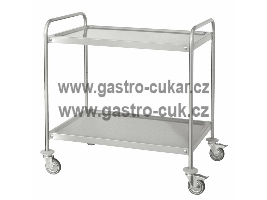 Vozík v nerezovém provedení se 2 policemi, čtyřmi otočnými kolečky (Ø100mm,2x bržděná). Police s prolisovaným zvednutým okrajem a spodní tlumící vrstvou. Zpevněné rohy se zesíleným nerezovým uchycením polic (není třeba zpevňovat svárem). Vozíky jsou dodávány v rozebraném stavu, balené v kartonu včetně montážního materiálu.