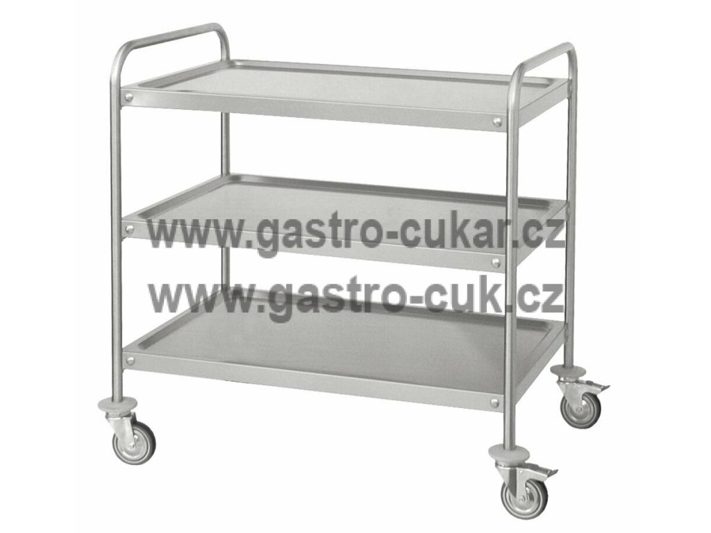 Vozík v nerezovém provedení se 3 policemi, čtyřmi otočnými kolečky (Ø100mm, 2x bržděná). Police s prolisovaným zvednutým okrajem a spodní tlumící vrstvou. Zpevněné rohy se zesíleným nerezovým uchycením polic (není třeba zpevňovat svárem). Vozíky jsou dodávány v rozebraném stavu, balené v kartonu včetně montážního materiálu.