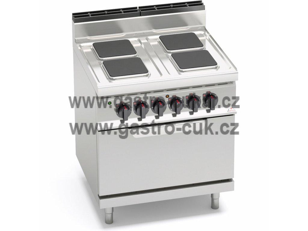Sporák s troubou je vybaven varnými plotýnkami z litiny. Pracovní plochu lze doplnit o ocelovou výplň prostoru mezi plotnami, čímž se dosáhne celistvé pracovní plochy. Teplota je regulována nezávisle nastavitelnými spínači. Přímá kontrola teploty umožňuje významně uspořit energie. Topná tělesa jsou hermeticky uzavřena v jednom celku, který je lisován v rovině do varné desky. Pracovní plocha a opláštění z nerez oceli AISI 304. Litinová varné plotýnky s bezpečnostním termostatem a regulací výkonu. Kompaktní provedení s otevřeným podstavcem. Konvekční trouba vhodná pro GN 1/1, nebo model se statickou multifunkční troubou pro GN 2/1. Trouby mají nově zesílené litinové dno a jsou vybaveny kvalitním těsněním dveří.