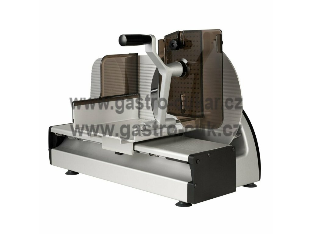 Nářezový stroj manuální pro profesionální použití na porcování a krájení různých produkt (uzeniny, maso, sýr, chléb, zeleninu a ovoce). Vhodný pro gastronomické provozy a menší prodejny. Opravdový multitalent se šírokým spektrem využití. Promyšlená konstrukce stroje zabezpečí nejlepší výsledky krájení, optimální přístup a komfort při čistění. Vysoký hygienický standard. Účinný systém chlazení motoru a hybridní pohon (šneková převodovka pohánějící klínový řemen) umožňuje efektivní a bezúdržbový přenos energie i při nepřetržitém provozu. Důmyslný "L" design umožňuje šikovnou kombinaci a těsné seskupení s úložnými tácky, krájecími deskami, nebo s váhou atd. Maximální řezná kapacita s minimální stopou, přesné a praktické nastavení tloušťky řezu od 0 až do 20mm. Vertikální provedení nářezového stroje, barva odolných plastů : černá (standardní), na objednávku v barvě (červená,bílá)