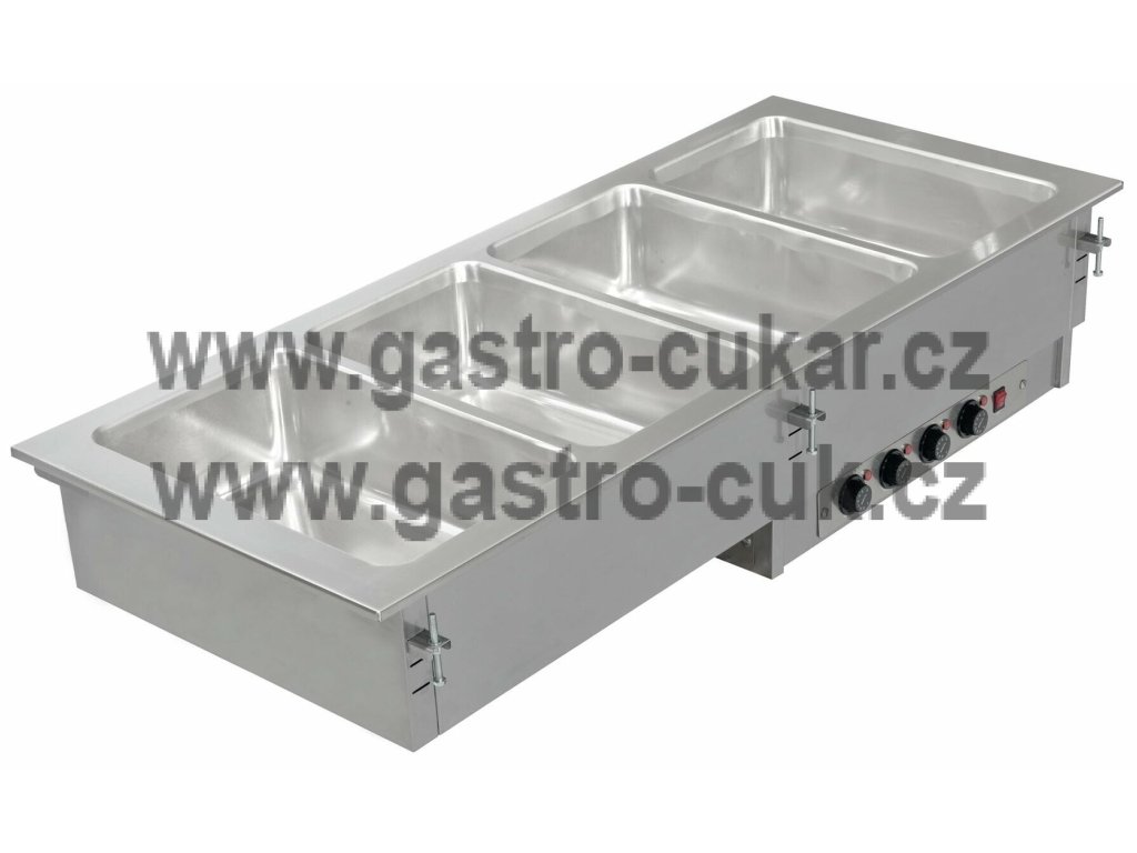 - Vestavná vodní lázeň - dělená je speciálně navržena pro uchovávání, prezentaci a distribuci teplých potravin uložených v hlubokých nerezových GN (dodávány volitelně).