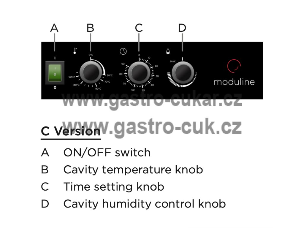 - Kontrolní panel teploty, času a vlhkosti. Elektromechanický (C), elektronický s digitálním displejem (D) nebo elektronický s dotykovým LCD displejem (E).