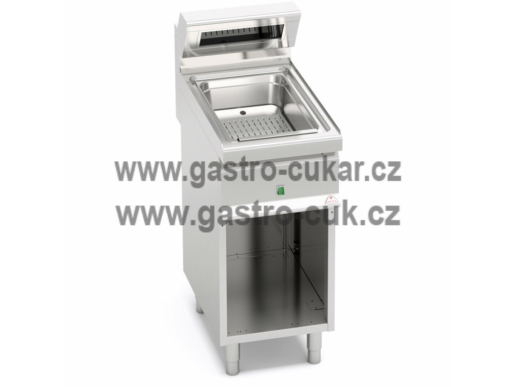 Nerezová vana pro GN s hloubkou 150 mm s perforovaným odkapovým plechem. Ohřev je prováděn infra zářičem. Kompaktní provedení s otevřeným podstavcem.